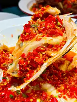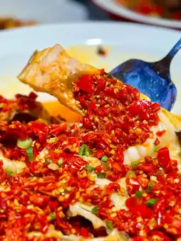 A fish head bigger than a basin paired with homemade chopped chili, forming a little volcano 🌶️ The fish eye’s gelatin sticks to your lips, the cheek is as smooth as tofu, and the sour and spicy broth soaks into the silver thread rolls. It’s unbelievably delicious!