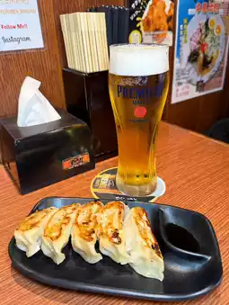 Besides ramen, the snacks are also excellent! The takoyaki is piping hot with chunks of octopus inside; the pan-fried dumplings are made to order, crispy on the outside and juicy inside, especially delicious with vinegar😋 Paired with a glass of SUNTORY draft beer, the foam is smooth and chill, giving a real Japanese izakaya vibe.