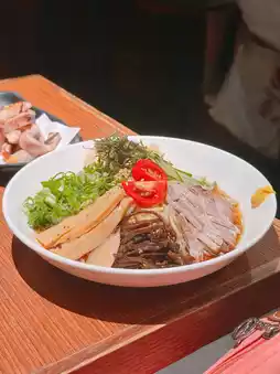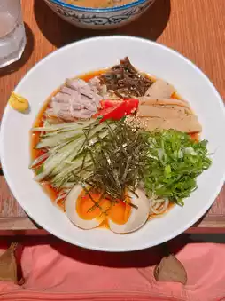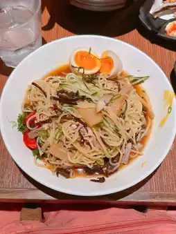 Chinese Cold Noodles (Small)🥢 A la carte $98💰 Includes soft-boiled egg🍳, char siu pork🐷, bamboo shoots, wood ear mushrooms, green onions, cucumber🥒, seaweed, cherry tomatoes🍅, yellow mustard, and cold noodle sauce😍. The cold noodle sauce is naturally sweet and sour☺️. After adding yellow mustard💛, it has a slightly spicy and tangy kick🌶️, making it even more refreshing and appetizing🤤. The noodles are cold and chewy😆, combined with various toppings for a rich texture💯.