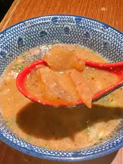 Beef Tendon BLACK Tsukemen (Small 200G)🍜 A la carte $98💰 Includes beef tendon🐄, green onions, onions🧅, char siu pork🐖, egg🥚. The broth is heavily seasoned with black pepper🧂, giving it a rich flavor😉. The beef tendon is tender and flavorful😋. The thick noodles are coated with the broth, bursting with beefy taste👍🏻.