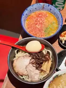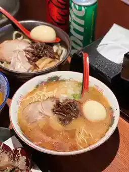 Rich and smooth tonkotsu broth enhanced with beef juice for a special savory collagen flavor. The translucent beef tendon is full of collagen and elastic texture. The thick chashu has a perfect balance of fat and lean meat, tender and flavorful without being greasy. A whole silky soft-boiled egg oozes sweet yolk, accompanied by spicy wood ear mushrooms and bamboo shoots. The thin noodles are chewy and hold the broth well.