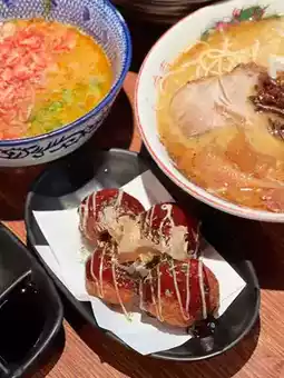 Tonkotsu broth mixed with sakura shrimp oil, topped with plenty of crispy sakura shrimp, releasing a strong fresh aroma. It also includes chashu, spicy wood ear mushrooms, bamboo shoots, and a soft-boiled egg. The thick noodles are chewier and more textured.