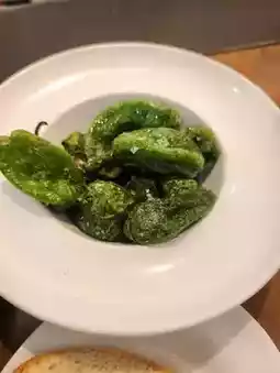 The lightly charred green peppers are crispy and perfectly salted.