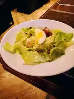 The Caesar salad comes with a small soft-boiled egg, fresh lettuce, and rich cheese flavor.