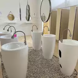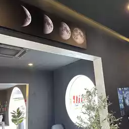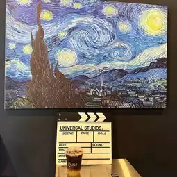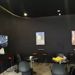 Around the bar, there are permanent seats extending from the wall and some extra chairs. 👕 There are also cool T-shirts to shop for. Next, there is the shop's dining area, which is decorated in many styles. There are paintings, a pool table, and plenty of photo spots.