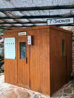 The accommodation offers a full range of amenities, including a sauna and a warm onsen (hot spring bath).
