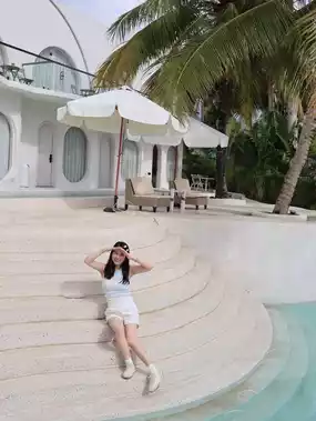 The coconut trees sway gracefully in the sea breeze, the clear blue sky and white clouds complement each other, the sea surface sparkles, the blue and white interweave, like a dream.