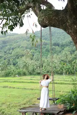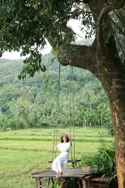 In front, there are rice fields and coconut groves, with rainforest mountains ⛰️ behind.