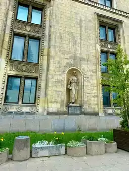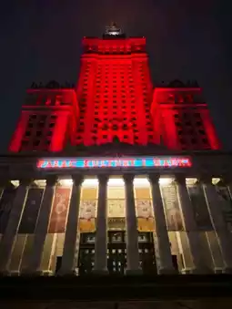 Poland's [Palace of Science and Culture] is located on the west side of Warsaw's Parade Square. It was built from 1952 to 1955 by Soviet laborers as a gift from Stalin to the Polish nation. The Palace of Science and Culture Pałac Kultury i Nauki is usually abbreviated as PKiN, and many Warsaw citizens also jokingly call it Stalin's syringe and Russian wedding cake. It is 234 meters (767 feet) high and has 3,288 rooms, 3 theaters, 1 swimming pool, 1 museum and a conference hall that can accommodate 3,000 people. This cultural palace was completed in just three years and is built in the Stalinist style. It is now used to hold various types of fairs, exhibitions, art performances and music events.