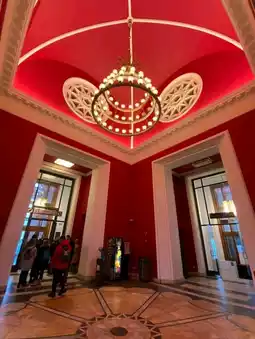 On the left is the theater and on the right is the concert hall, which has a gorgeous Soviet-style interior and a bar. Admission is free, but you can buy a ticket to the top floor to overlook the city.