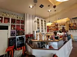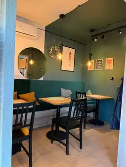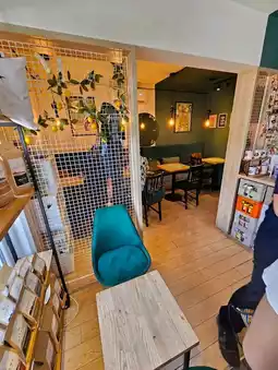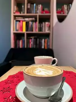 This cafe has a relaxing atmosphere, with warm lighting and soft colors.
