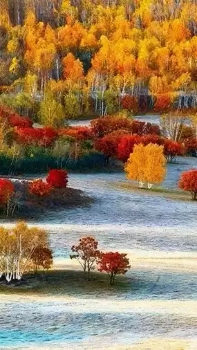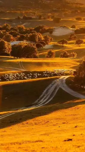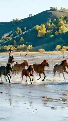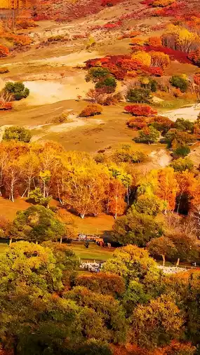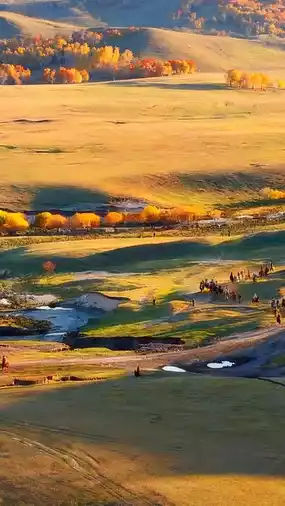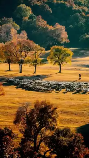 · 🐴 Morning: Frog Dam (a hidden gem for photographers, golden white birch forest, scattered haystacks, and shepherds herding sheep in autumn, like a stunning oil painting)