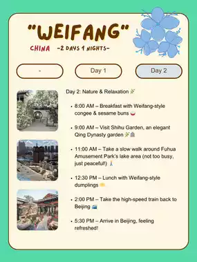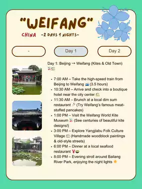 • 7:00 AM – Take the high-speed train from Beijing to Weifang 🚄 (3.5 hours)