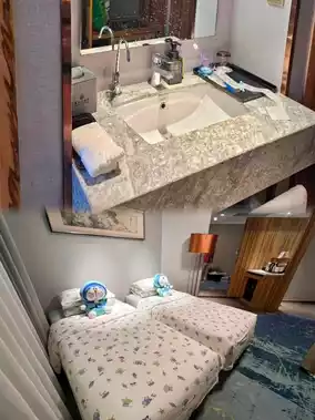 The hotel has two buildings, A and B. The rooms in Building B surround a large leisure courtyard where you can have coffee and take kids for a walk, though the decor is a bit dated. Building A features a modern minimalist style with natural wood furniture paired with gray paper wallpaper, simple and clean. The bedding and pillows are all down, very comfortable to sleep on, and there’s a large bathtub—after a tiring day, soaking in it is just so relaxing! Rooms are fully equipped with umbrellas, safes, and air purifiers. At night, they even provide fruit and plush toys—such warm-hearted service!