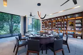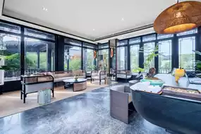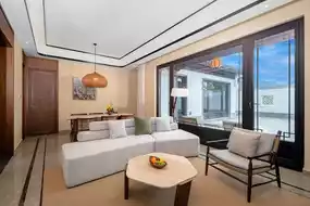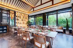 The hotel's architectural style is unique, with white walls and black tiles reminiscent of Jiangnan gardens, which is also the hotel's feature. Staying at the hotel is like living in a garden, with garden elements everywhere from public areas to guest rooms. The hotel lobby has a lounge area where you can take a look at the surrounding environment while checking in. On one side is a rockery and water pool, and on the other side is a winding corridor. The furniture and materials are chosen in an antique style. The guest rooms are villas, with two-bedroom and three-bedroom villas to choose from, each with a courtyard and a mini golf course. Unlike other hotels, the guest rooms here are equipped with kitchens, giving a more homely feel. The living room is very large, making these rooms suitable for family stays. I prefer the rooms upstairs, which have a very open view, offering a panoramic view of the mountain and forest scenery outside the window. This room also has a tea table, with exquisite furniture and tea sets, and the quiet surroundings make it perfect for tea tasting. The restaurant is connected to the lobby by a long corridor. Walking into the restaurant, you can see dense greenery outside the window, and the hotel's buffet breakfast is enjoyed here. The breakfast varies every day; the first day's breakfast was semi-buffet, with some items self-selected and others ordered à la carte, and surprisingly, sea cucumber was served for breakfast. There are also elegantly decorated private rooms, with floor-to-ceiling windows overlooking the lake in the middle of the golf course. The hotel also has some old local houses that are now the SPA area, and these old houses are also very charming.