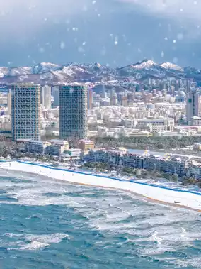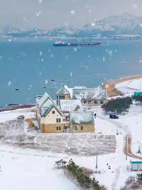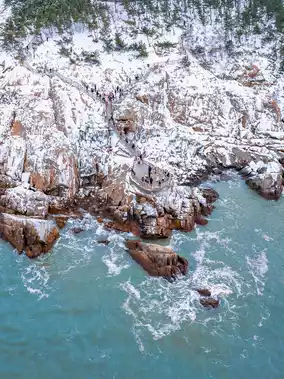 1⃣️ Overlook the coastline to see the waves and snow-covered beach.