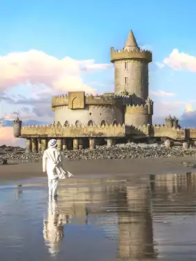 A lonely castle perched on the coast, walking on the beach, as if breaking into a medieval oil painting, navigate to "CCTV Weihai Film City"