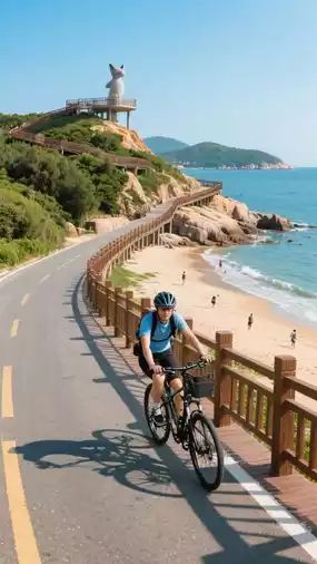 Next, start the highlight of the coastal road cycling: from Putao Beach Bathing Area, passing International Bathing Area and Jinhai Bay Boardwalk, ending at Maotoushan No. 5 Viewing Platform (about 8 km total). Every frame along the way looks like a movie scene: