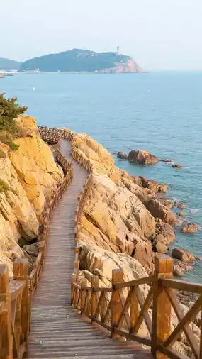 Jinhai Bay Boardwalk: winding over rocks, with a distant view of Liugong Island;