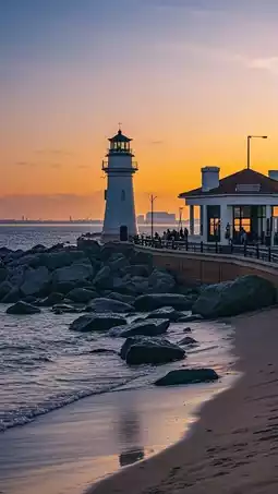 Yuehai Park Lighthouse: One hour before sunset, use lighthouse as foreground to capture golden sea light.