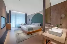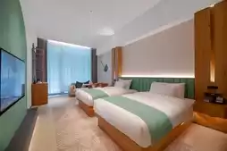 Upon entering, curtains slowly open, and the intelligent voice system in the room is very convenient, meeting modern lifestyle demands. The fresh green color typical of Fangcaodi is the highlight of the room, with sofas, tables and chairs, floor-to-ceiling windows, and dry-wet separated bathrooms all arranged comfortably. The extra-large floor-to-ceiling windows let you see the scenery as soon as you wake up. PS: The hotel provides children's amenities; please call the front desk if needed, and staff will deliver them.