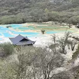 In front of the temple, a landscape of pines dusted with snow, golden sands, tiered waterfalls, and turquoise pools paints a breathtaking picture. As part of a dual UNESCO natural and cultural heritage site, Huanglong Ancient Temple forms a dazzling “human jade pool” together with the nearby Five-Color Pools — a 1 km² collection of nature’s finest colors.