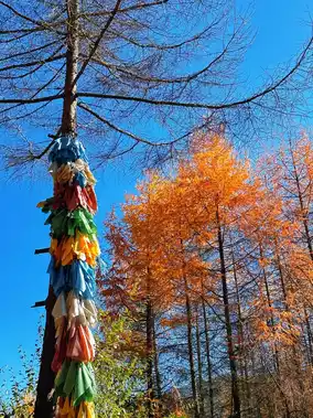 β‘ Songlin route: continue uphill from Lama Temple to cross the pine forest, walking and taking photos without getting tired, the ground covered with soft golden pine needles