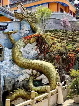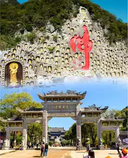 Passing through the archway, I reached the temple's main gate and the Hall of the Three Gates. Stepping inside, I entered the temple grounds, where grand halls rise tier upon tier, following the mountain's contours. Each building exudes an air of majesty and solemnity. The adjacent cliff face is dotted with caves of varying sizes, each housing golden Buddha statues. A giant red character for "Buddha" dominates the central cave, creating a spectacular sight.
