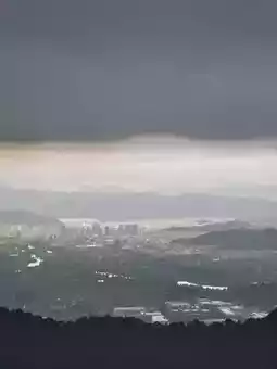 Previously, when I was at the top of Fang Mountain or driving on the highway in Wenling, I had seen a huge temple standing alone on top of a very steep mountain peak, which was extremely impressive. Later, I found out that this was Louqi Peak, probably named because it looks like a flag unfurled on the mountain top. We drove from Shuitong'ao directly to the parking lot at the foot of Louqi Peak. On the way, the bright sunshine by the sea was already covered by dark clouds, with only a few gaps showing the spectacular Tyndall effect. By the time we reached the parking lot at the foot of the mountain at 3:30 pm, the sky was already very oppressive.