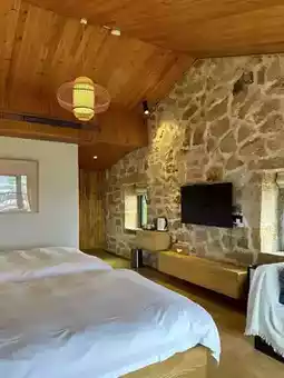 The room is decorated particularly warmly, using wood and rock elements in its design, paired with warm wooden furniture, stylish lamps, ornaments, decorative paintings, and soft, skin-friendly bedding, making people feel very comfortable.