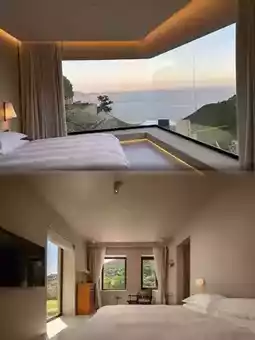 During check-in, the butler warmly welcomed me, helped carry my luggage to the room, and thoughtfully introduced the homestay facilities and nearby travel tips. The meticulous service made me feel very warm. I stayed in the standalone villa of Building 1. Upon entering, the wabi-sabi style design was eye-catching, with raw and rugged stone walls perfectly blending with exquisite vintage furniture, combining rustic charm and elegance. The oversized floor-to-ceiling windows brought the boundless sea view fully indoors. Lying on the bed, it felt like I could reach out and touch the sea, and my body and mind were healed by this beautiful scenery. The room was equipped with a dehumidifier, disposable face towels, a Dyson hairdryer, L’Occitane toiletries, a mini fridge (with complimentary drinks and Norwegian imported natural spring water VOSS), and a sterilizing cabinet for cups—truly thoughtful.