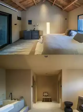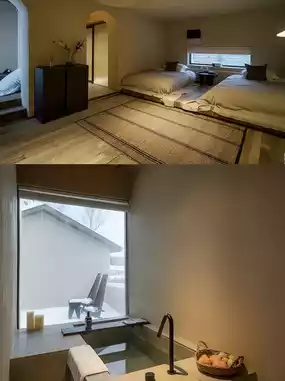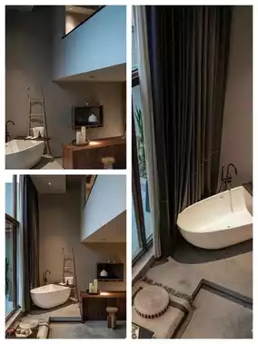 As you enter the door, the wet and dry separated bathroom is done superbly. There's also a large bathtub, smart toilet, and it's really comfortable at night! After washing up, sitting in the small courtyard equipped with the loft, ☕️ order a cup of MOJ coffee, have a chat, and worries instantly disappear~