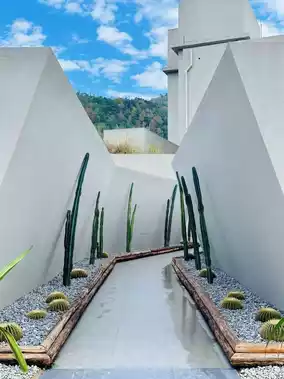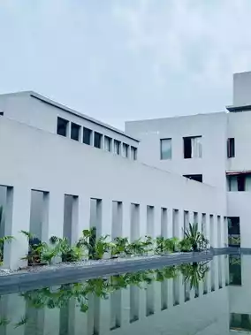 ✔️ The hotel features a gray and white theme with three buildings and 41 rooms