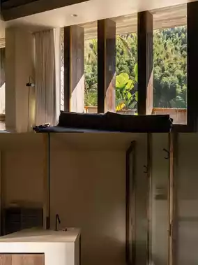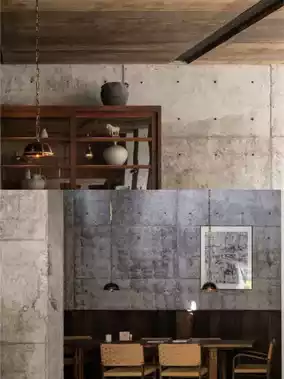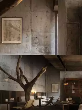 The café ☕️ and infinity pool face the valley, offering an unobstructed view of birds 🦜, streams, and the forested 🌲 mountains opposite. The café's walls retain the rustic fair-faced concrete, paired with vintage furniture, creating a relaxed and rustic atmosphere. Large glass doors 🪟 bring the bamboo forest in front into the interior. It is worth mentioning that the walls of the guest rooms are made of micro-cement, and the roof uses locally recycled old wooden beams, preserving those century-old furniture and crafts, blending modernity with tradition, tracing nature, returning to the essence, and seeking a balance between rusticity and modernity.