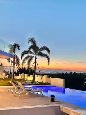 Blue sky, white clouds, green lawn, and infinity pool!
