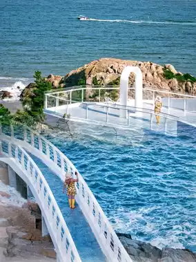 The largest artificial beach in southern Zhejiang. At sunset, orange light bathes the sea surface. Fireworks shows and bonfire parties on summer weekends (30 yuan entrance fee, including performances).