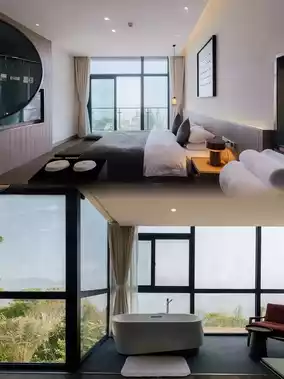 - Facilities: There is a gracefully curved leaf-shaped infinity pool🏊♀️ that extends over the cliff edge, echoing the sea🌊, making it a perfect spot for photos📸. The cliffside sea view restaurant🍴 and semi-open coffee bar☕ offer seafood delicacies🦞 and afternoon tea🍰. Additionally, the hotel has two viewing terraces at different heights🌌, ideal for watching sunrises🌅, sunsets🌇, and starry skies✨. Tents and canopies⛺ can be set up on the lawn for picnics🧺 or barbecues🍢.