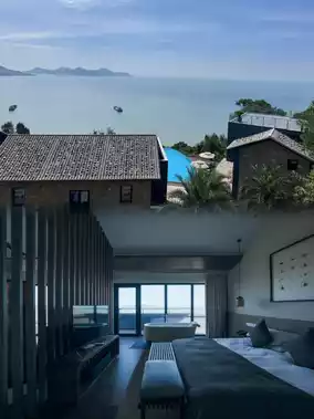 - Rooms: There are more than 30 rooms🚪, all sea view🌊, starting from 30 square meters, with villa options up to 200 square meters🏡. The rooms are bright and transparent☀️, featuring abundant wooden furniture🪵 paired with ash gray wall decorations. Under warm yellow lighting💡, they create a cozy ambiance🏘️.