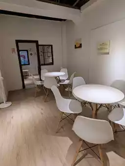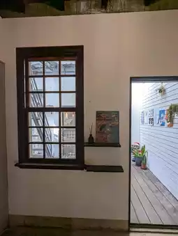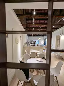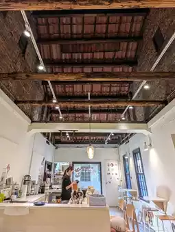 The space is high and deep, with exposed brick walls and wooden beams on the upper half and white-painted walls and wooden floors on the lower half, creating a cozy little world with a very textured feel, and the gentle beauty unique to old houses in Tainan.