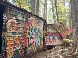 Train Wreck, although open year-round, some of the lots inside are more wilderness, encounter rain or snow periods, be careful of wet and slippery feet. Some of the abandoned carriages have signs of disrepair. Try not to climb when taking pictures for safety.