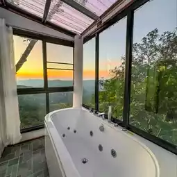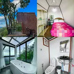 We chose to stay at the Tree House, which is the newest room here. There are only 2 houses. It comes with a Jacuzzi and a balcony in front of the room where you can see a panoramic view. You can sit and watch the sunset from the front of the room. The view is very beautiful. The weather is very cold these days. But there is a heater in the room. And the Jacuzzi has warm water and bubbles. It's very good. 🥰