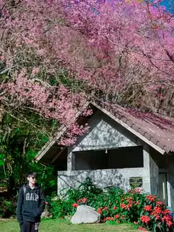 The Ngao-Ngao Watershed Management Unit in Wiang Kaen District is one of the most beautiful spots in Chiang Rai to admire the blooming Nang Phaya Sua Krong (Thai cherry blossoms). Located not far from Phu Chi Fa, the cherry blossoms here are stunningly vibrant. The weather is cool and pleasant, and along the 10-kilometer stretch, you can see rows of cherry blossom trees beautifully lined up.