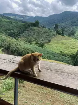 Enjoy a drink amidst mountain views, cool breezes, and a super chill atmosphere with your adorable cat.