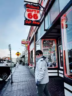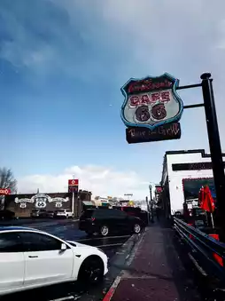 Route 66 logos adorn the pavement and walls, giving any photo a truly American highway feel. The streets are lined with vintage restaurants, souvenir shops, and cowboy-style bars, creating a rich atmosphere.