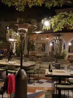 Outdoor terrace with a fountain in the middle.