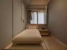 This tea Zen-style two-bedroom apartment is located in a quiet building by Wuhai Lake, away from the bustling main streets but within walking distance to the lakeside trail. Upon entering, the wooden furniture and plain gray walls create a simple Zen atmosphere.