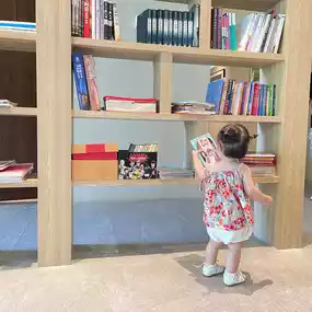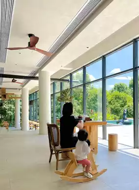↗️The lobby has floor-to-ceiling glass, and there is a bookshelf next to it, which is full of books. You can read here and relax yourself📖.