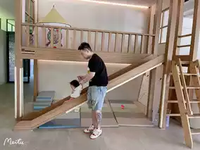 ↗️There is a double-decker slide in the hall, with a round tent and toys on top, and a rocking horse underneath, suitable for children to play🎠.