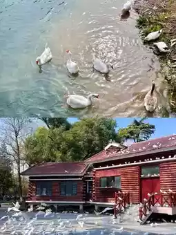 Geese and ducks in the lake, fallen leaves blown by the wind