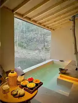 The homestay has its own cafe and a separate cabin for hot spring baths, which need to be booked in advance. You can also drive to the top of the mountain to watch the sunset in the evening.